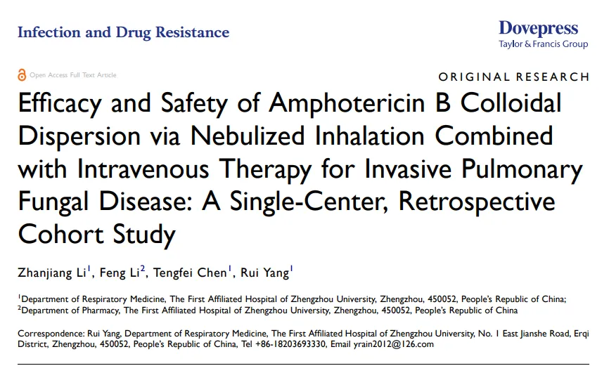 近期,Infection and Drug Resistance?發表了一項由鄭州大學第一附屬醫院呼吸內科楊睿教授牽頭開展的,侵襲性肺真菌病(IPFD)的患者接受兩性霉素B膽固醇硫酸酯復合物(ABCD)霧化吸入聯合靜脈注射進行抗真菌治療的回顧性研究的結果,旨在探究IPFD患者使用ABCD霧化聯合靜脈注射治療的有效性和安全性。