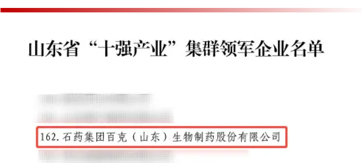 石藥百克獲評山東省“十強產業”集群領軍企業