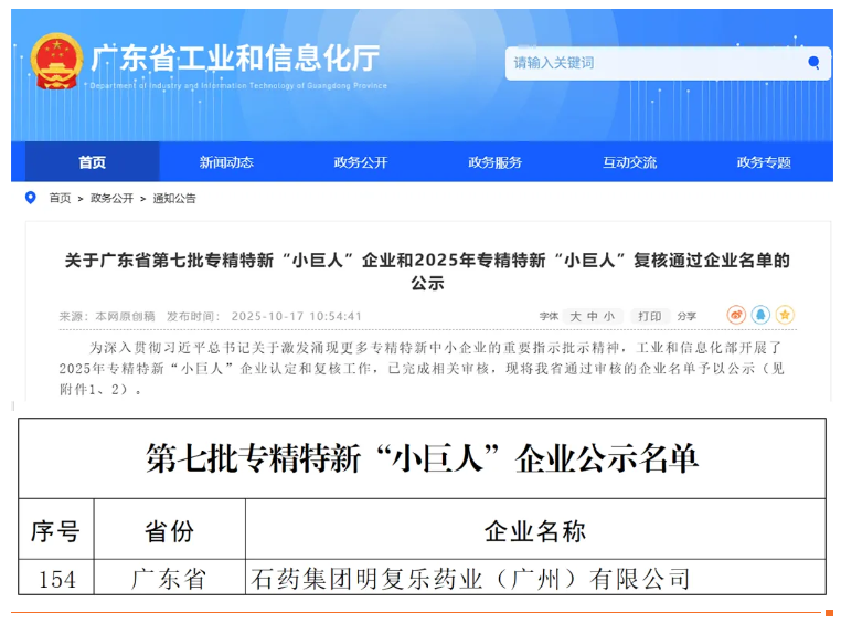 近日,廣東省工業和信息化廳公示了第七批專精特新“小巨人”企業名單。石藥集團明復樂藥業(廣州)有限公司(下稱:石藥明復樂)成功入圍,通過了國家工業和信息化部的認定,榮獲國家專精特新“小巨人”企業稱號。