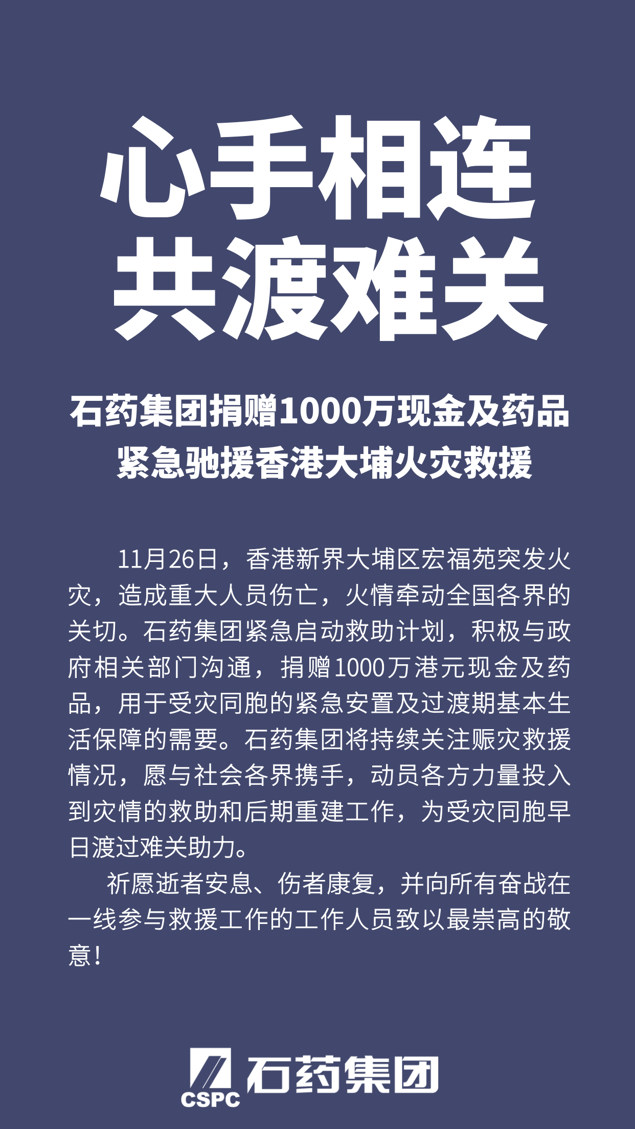 石藥集團(tuán)捐贈(zèng)1000萬(wàn)現(xiàn)金及藥品 緊急馳援香港大埔火災(zāi)救援