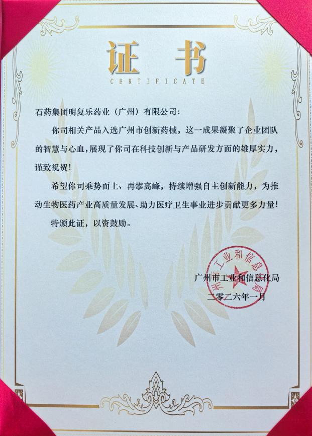 實力登榜!石藥集團明復樂榮獲“廣州市創新藥械”稱號