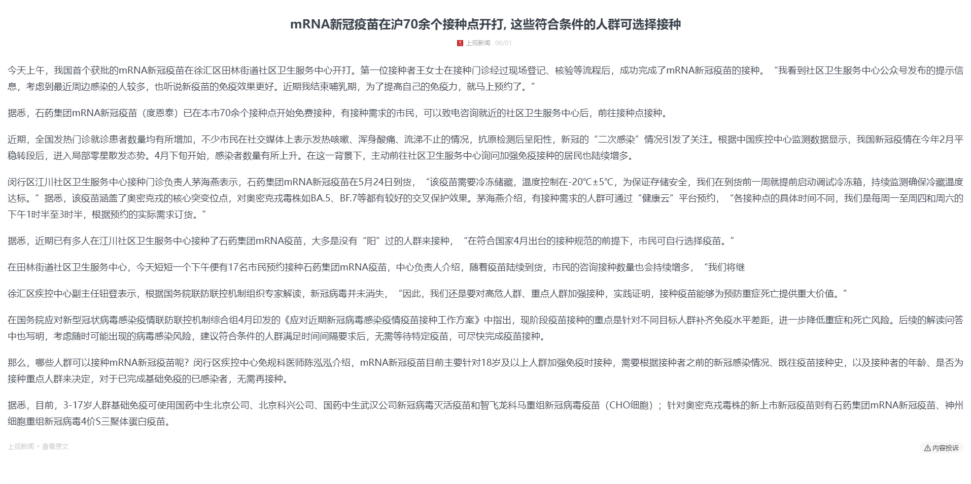 mRNA新冠疫苗在滬70余個接種點開打, 這些符合條件的人群可選擇接種