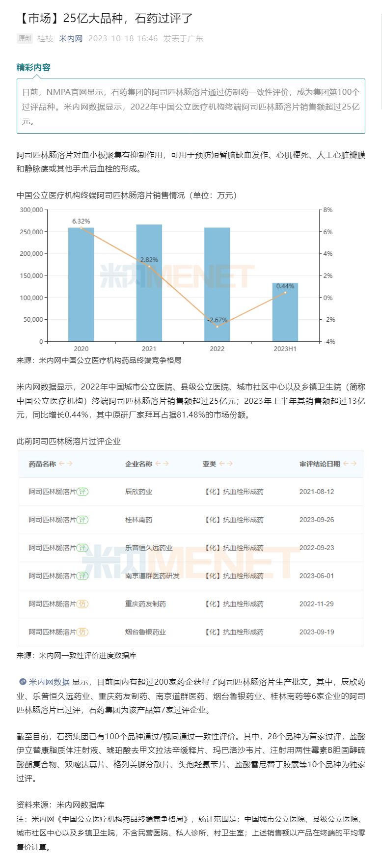 米內網(wǎng)數(shù)據(jù)顯示,目前國內有超過200家藥企獲得了阿司匹林腸溶片生產批文。其中,辰欣藥業(yè)、樂普恒久遠藥業(yè)、重慶藥友制藥、南京道群醫(yī)藥、煙臺魯銀藥業(yè)、桂林南藥等6家企業(yè)的阿司匹林腸溶片已過評,石藥集團為該產品第7家過評企業(yè)。