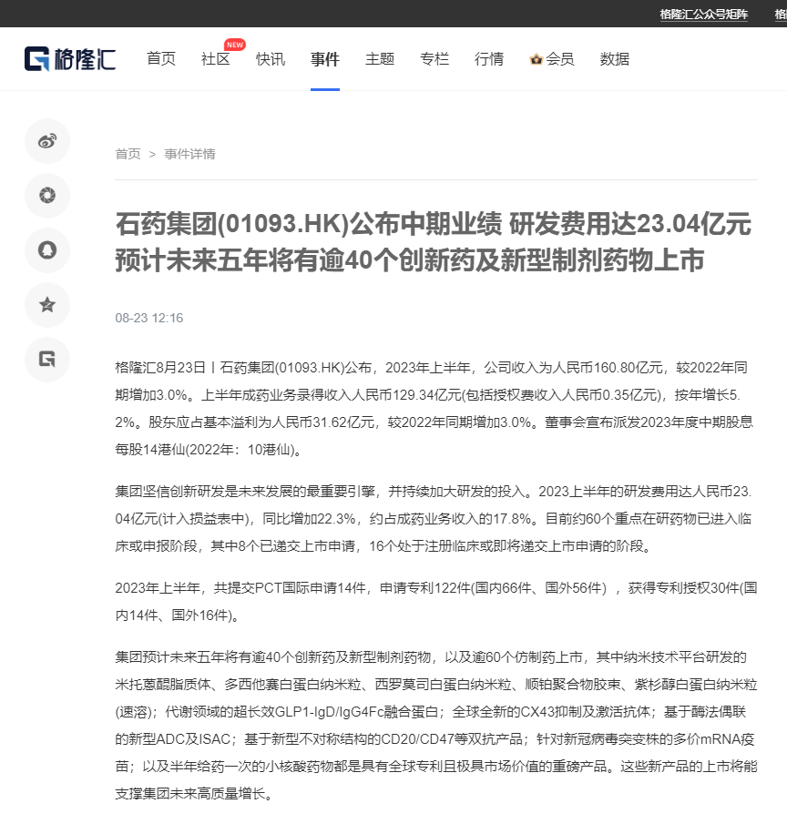 石藥集團(01093.HK)公布中期業績 研發費用達23.04億元 預計未來五年將有逾40個創新藥及新型制劑藥物上市