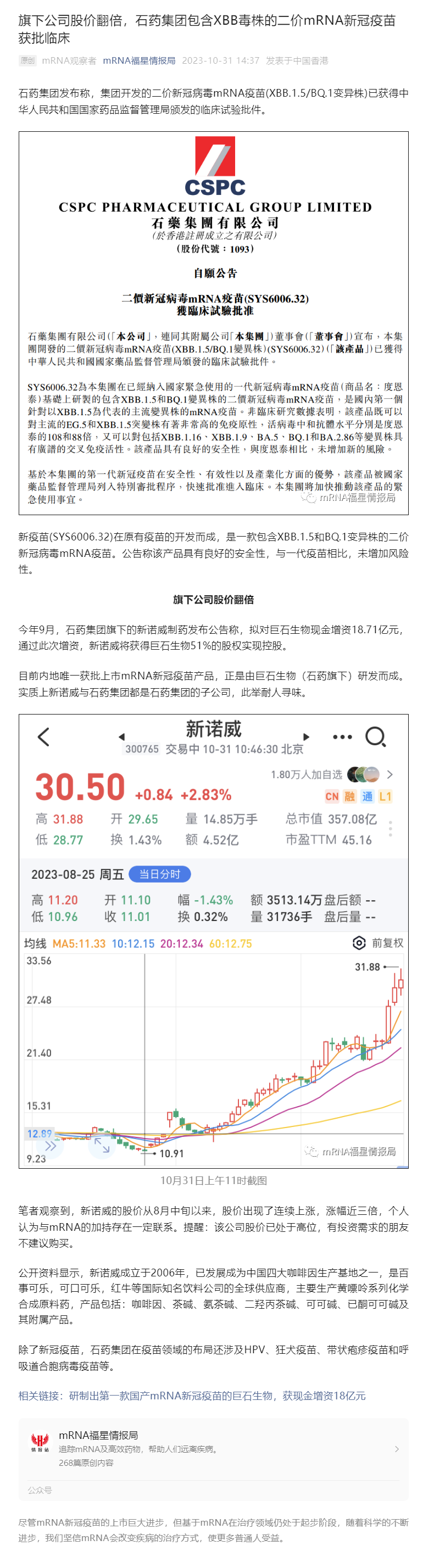 旗下公司股價(jià)翻倍,石藥集團(tuán)包含XBB毒株的二價(jià)mRNA新冠疫苗獲批臨床