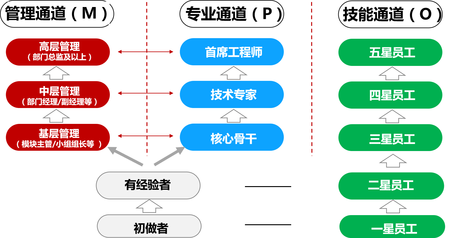 ① 管理通道(M)側(cè)重管理能力提升,專業(yè)通道(P)側(cè)重技術(shù)領(lǐng)域縱深發(fā)展,兩者跨職能、跨領(lǐng)域發(fā)展。